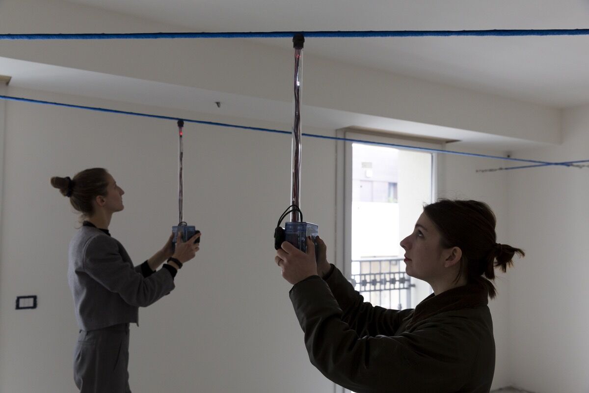 This prompted her to create Game of Skill 2.0 (2015), in which audiences listened to a reading of a text about the future written by Kim and voiced by a museum intern. The recording is only audible when a special sound-emitting device has its antenna touched to an overhead magnetic strip that cuts through the gallery space. Performed backward or forward, with the speed of the sound proportional to the participant’s movement, the piece physically enacts the process of “scrubbing,” by which one fast-forwards or rewinds through a recording.