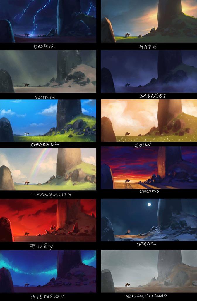Herman Tulliken - colours vs moods https://www.gamasutra.com/blogs/HermanTulleken/20150729/249761/Color_in_games_An_indepth_look_at_one_of_game_designs_most_useful_tools.php